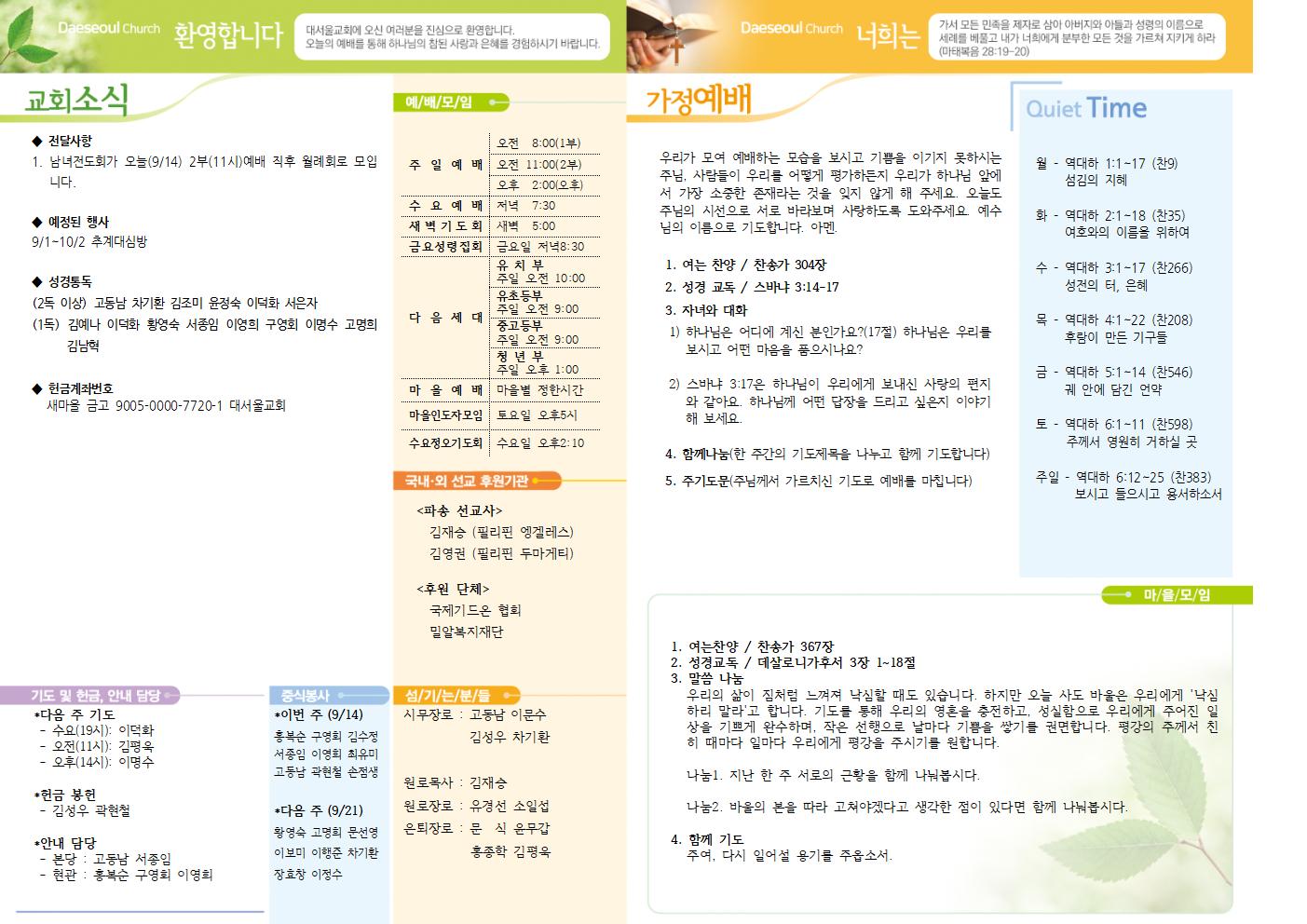1. 남녀전도회가 오늘(9/14) 2부(11시)예배 직후 월례회로 모입니다.