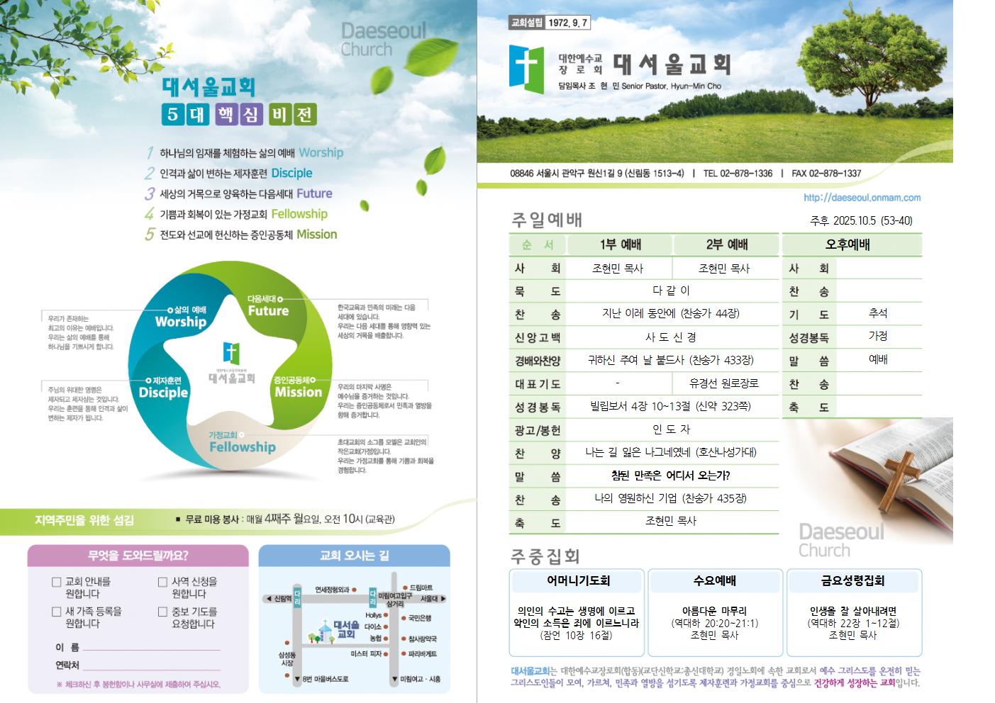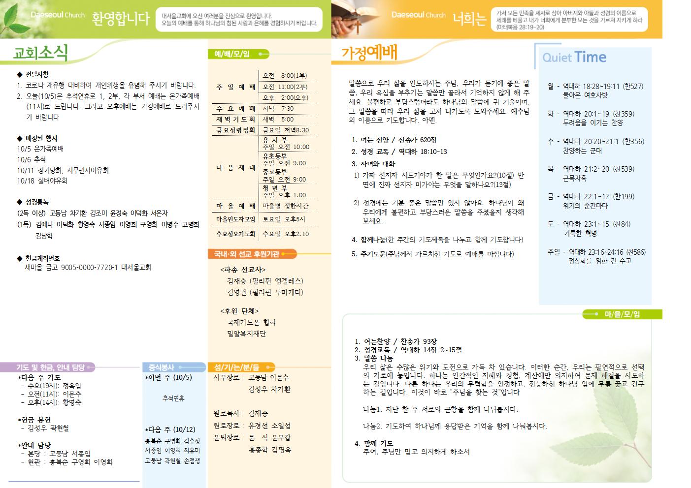 2. 오늘(10/5)은 추석연휴로 1, 2부, 각 부서 예배는 온가족예배(11시)로 드립니다. 그리고 오후예배는 가정예배로 드려주시기 바랍니다