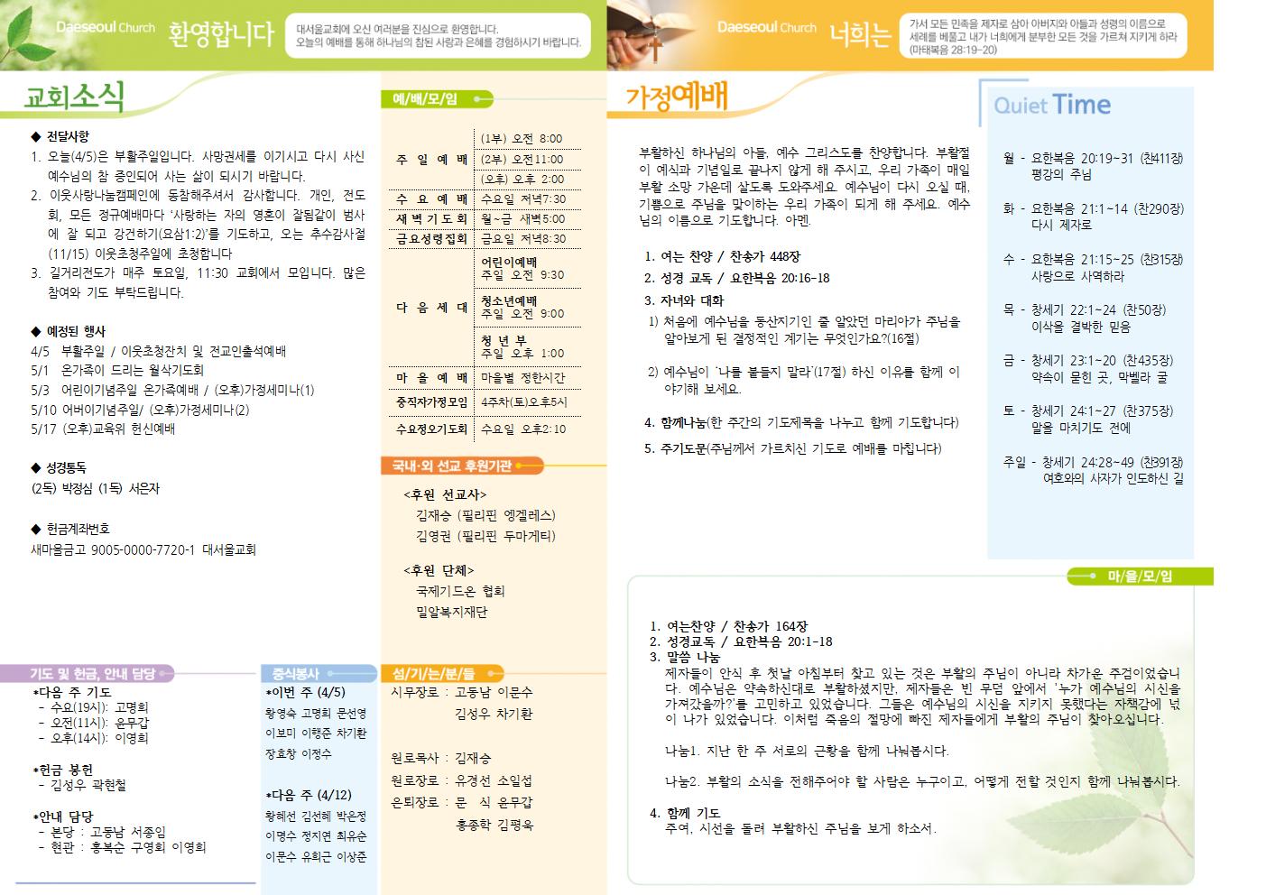 1. 오늘(4/5)은 부활주일입니다. 사망권세를 이기시고 다시 사신 예수님의 참 증인되어 사는 삶이 되시기 바랍니다.